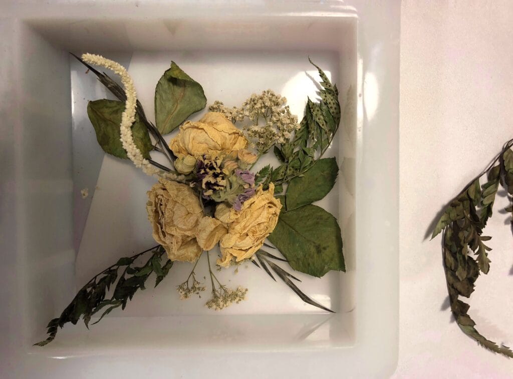 התחלתי לעבוד איתו מיד אחרי החתונה. ייבשתי את זר הכלה שלי ואת הזר שקיבלתי מתנה מהעבודה, ואז התחלתי לחשוב איך אפשר לשלב את הפרחים בתוך ה-Resin. זה היה חומר חדש ובלתי מוכר, אז ניגשתי אליו בזהירות. כפפות, מסכה (כדי לא לשאוף אדים), ומנות קטנטנות – כמויות מדודות בכוסיות קטנות של סירופ תרופה.